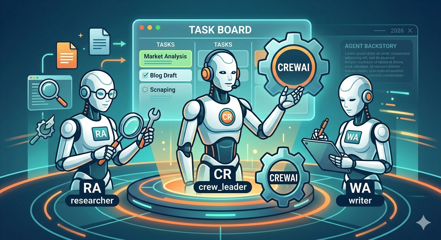 에이전트(Agent)에게 역할(role), 목표(goal), 배경(backstory)을 부여한다. 태스크(Task)를 정의하고 에이전트에게 할당한다. 크루(Crew)가 에이전트들을 묶어서 실행한다.